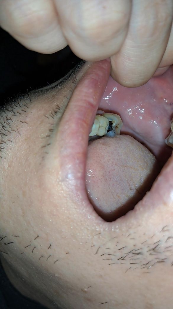 일단 충치가 너무 심해서 충치치료를하셔야될것같습니다 그리고 하얀색은 볼살이 치아에 씹혀서 생긴것같습니다.