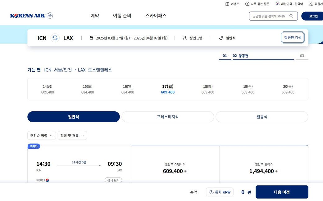 대한항공 왕복으로 검색을 했는데 609,400원으로 나왔는데.. 저게 왕복 가격인가요? 아님 편도 가격인가요?