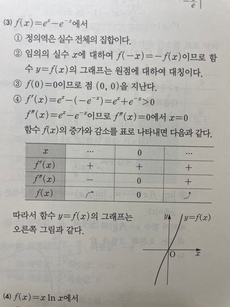 x = 0에서 변곡점을 갖고, x < 0에서는 아래로 볼록, x > 0에서는 위로 볼록한 형태를 그립니다.