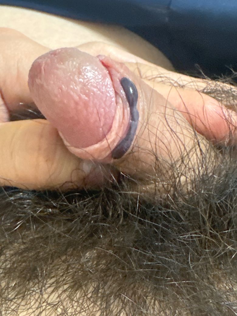 사진에서 포피(prepuce) 부위에 검푸른색의 선형 혈관이 튀어나온 소견이 확인됩니다. 통증은 없다고 하셨고, 관계 후 다음날 발견하셨군요.