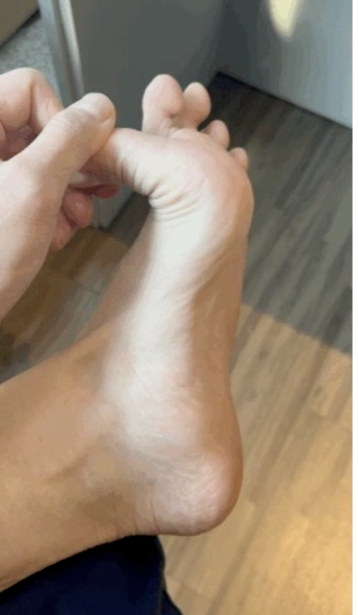 그 후 통증이 약간 사라진다면, 걷기전에 아래 사진처럼 엄지발가락을 잡고 발등굽힘하여 발바닥 전체를 늘려주는 것이 큰 도움이 될것같습니다.