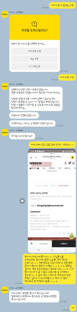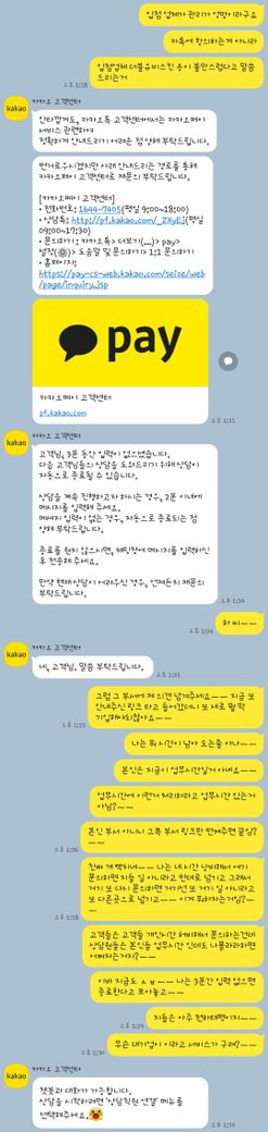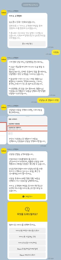 무슨 대기업들이 이라고 서비스들이 엉망이댜?ㅡㅡ 삼성전자는 정확히 기억이 안나는데 어쨌든 최근 실망한 대기업들이 세군데 있었는데 지금 막 분노가 끌어오른 카카오만 말해보자면ㅡㅡ 아니 이럴거면 애초에 관련부서로 연결이 가능하게 선택지 폭을 넓여두던가ㅡㅡ 아무리 눈을 크게 뜨고 찾아봐도 상품 문의 관련해서는 없길래 타이핑 해서 설명하려고 아무곳이나 연결했드만 이지랄이네?ㅡㅡ 막말로 지들은 지금 업무시간 아니야?ㅡㅡ 그럼 이 행위는 업무태만 아닌가?ㅡㅡ
