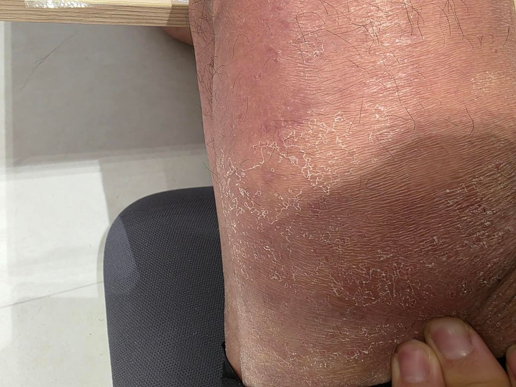 대퇴 의족 착용 부위에 경계가 비교적 불명확한 홍반, 건조한 인설(각질), 피부가 두꺼워진 소견이 보입니다. 가려움이 동반되고, 여행 이후 발생했다는 점을 고려하면 단순 건조증보다는 자극성 또는 알레르기 접촉피부염, 의족 착용으로 인한 마찰성 피부염이 우선 의심됩니다. 환경 변화와 땀, 습기 증가도 악화 요인으로 보입니다. 무좀과 같은 진균 감염 가능성도 완전히 배제되지는 않습니다만, 전형적인 가장자리 융기나 중심부 소실 소견은 뚜렷하지 않습니다.