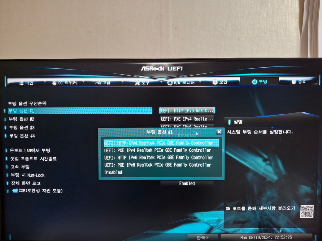 위에서 부터 하나씩 선택하면서 부팅 해보시기.바랍니다. 랜부팅일리는 없고 메인보드의 전지를 뺏다가10초뒤에 다시 꼽는것도 추천드립니다