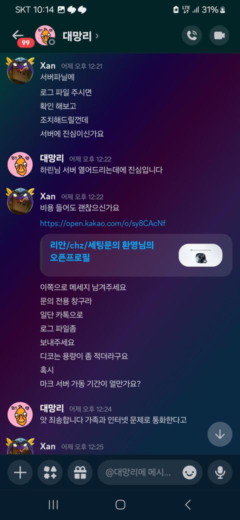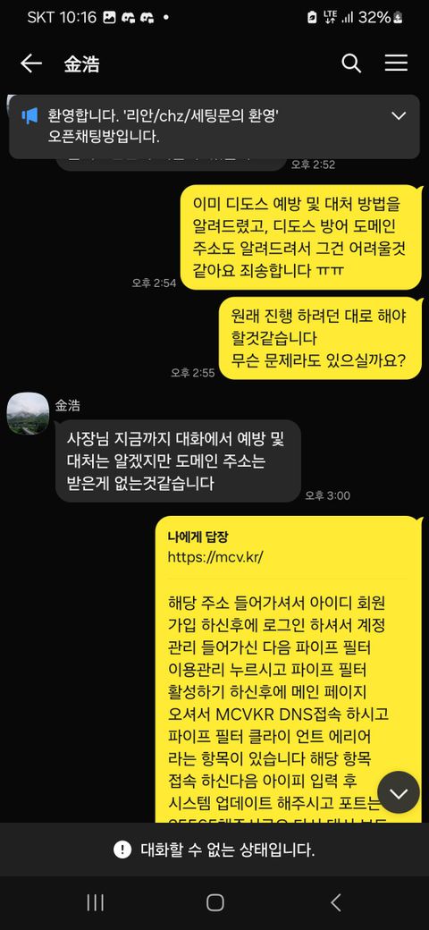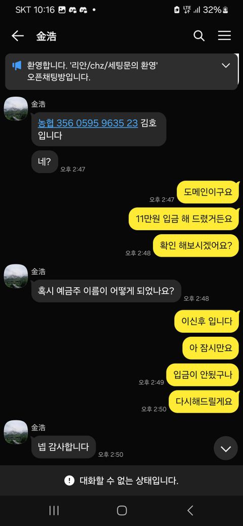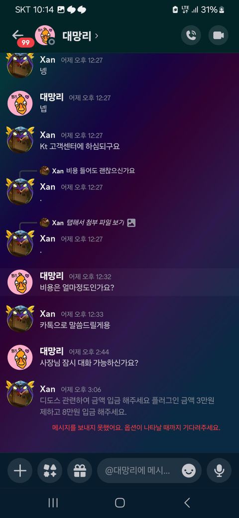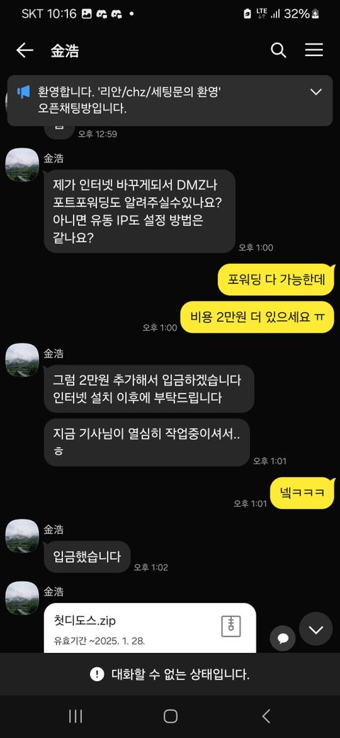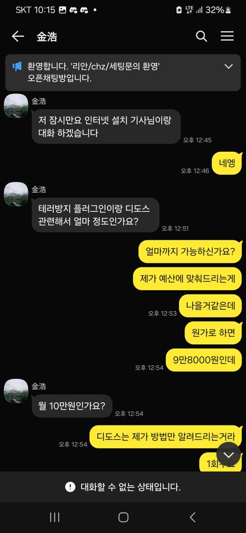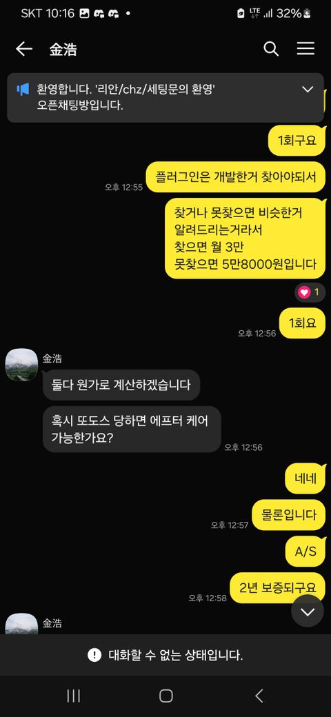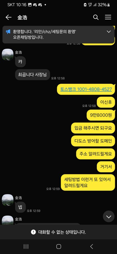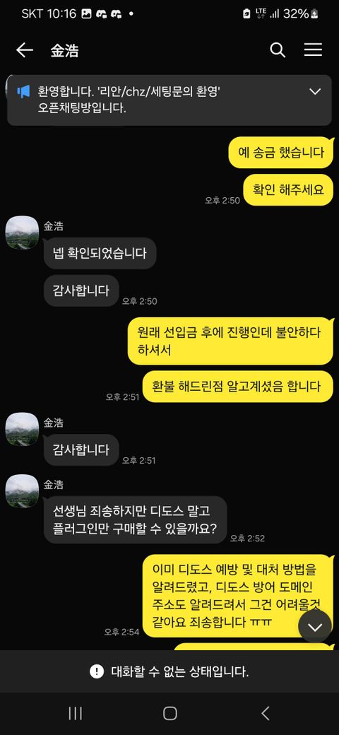 디도스 방어 및 여러 플러그인을 요청하여서 진행중 입금을 총 11만8000원을 입금 받았고 미원격 세팅으로 진행하는 과정에서 환불을 요청하셔서 환불 수수료 겸 8000원을 제외 한 금액인 11만원을 환불 해 드렸습니다. 그리하여 진행중 내용전달 및 기타 내용들을 포함하여 안내드린 후 결제 안내를 드리기도 전에 차단하고 도망갔습니다.