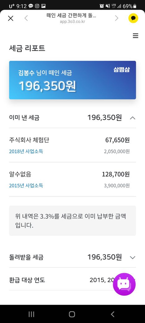 질문하신 내용에 대하여 아래와 같이 답변 드립니다.기한후신고를 통해 환급이 가능합니다. 홈택스>신고/납부>종합소득세>기한후 신고를 통해 진행이 가능합니다. 포털사이트에 '3.3%기한후신고'등으로 검색을 하시고 셀프신고 관련 블로그를 참고하시면 충분히 혼자 가능합니다.