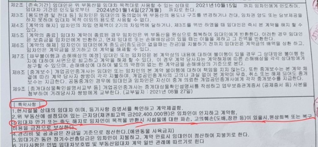 아래 사진 내용은 세입자 임차인 계약서 특약조건 3번