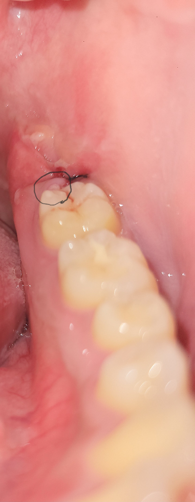 사진에 보이는건 잇몸입니다. 큰문제가 잇는건 아니니 너무 걱정은 하실필요가 없을것같습니다.