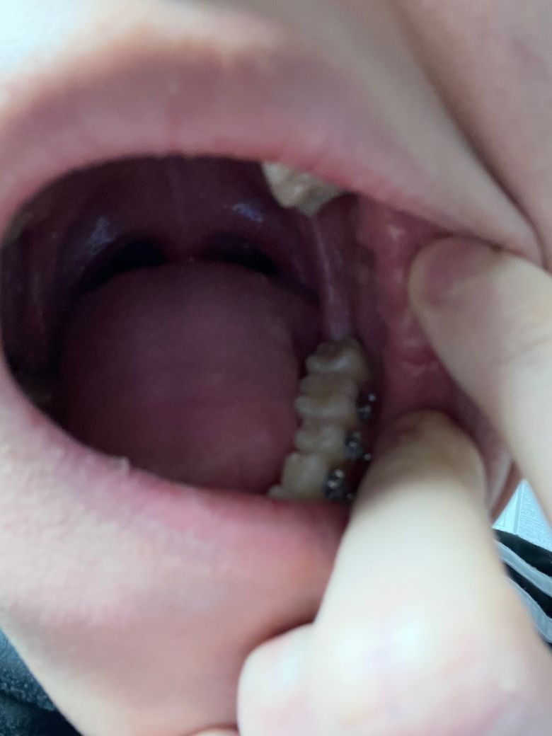 사진상으론 발치 부위가 잘 안보이고 정상 해부학적 구조인 raphe만 보입니다.
