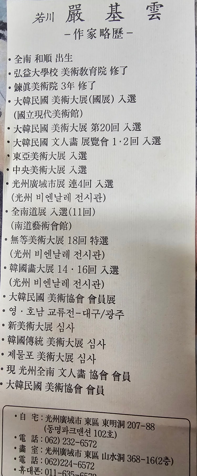 작가는 若川(약천) 嚴基雲(엄기운)입니다. 若川(약천)은 호이고, 嚴基雲(엄기운)이 성명입니다. 전남 화순 출신이고, 주로 호남권역에서 활동하신 분입니다. 그림은 필치가 섬세하고 유려합니다. 미술품을 전문으로 취급하는 경매 사이트를 찾아보시면 더러 있습니다. 다만, 동양화 시장이 침체하여 그다지 높은 가격을 기대하기는 어렵습니다. 경매 사이트에서는 작가의 작품을 구매하거나 판매할 수 있는 다양한 옵션을 제공하며, 미술품 전문 경매 사이트에서 가격을 추정할 수 있는 전문가의 조언도 받을 수 있습니다. 다만, 동양화 시장이 침체되어 있더라도, 품질 높은 작품이나 그 작가의 인지도가 높다면 일정한 가치를 인정받을 가능성도 있습니다. 아무튼 크게 작품의 가치가 있는 것은 아니니 그냥 장식용으로 소장하시면 되겠습니다.
