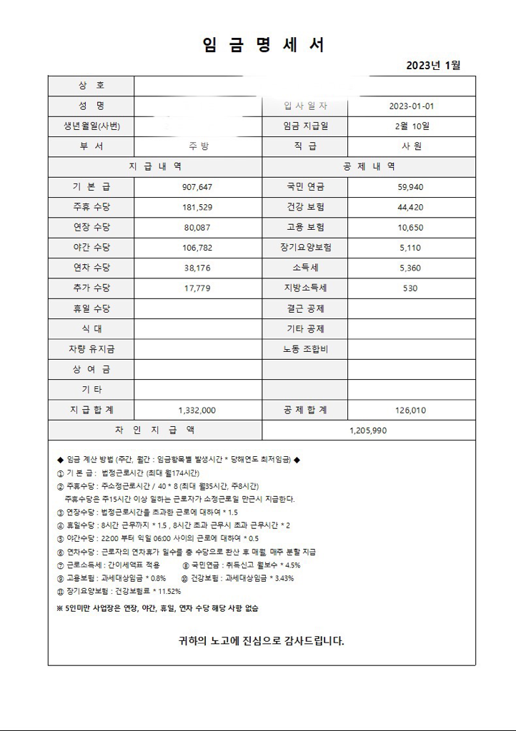 야간수당을 근로계약서상 0.5배 입니다. 일요일에는 하루에 12시간을 일하는 경우가 많습니다. 그럼 제가 최종으로 받을수 있는 급여가 얼마인지 알고 싶습니다..!
