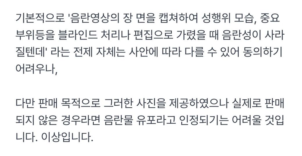 첫번째 사진이 질문이고 두번째가 사진이 답변인데 답변에 보면 판매 목적으로 그러한 사진을 제공하였으나 실제로 판매 되지 않은 경우에 음란물 유포라고 인정되기 어려울 것이라고 하셨는데 여기서 제공이라는게 편집된사진을 포함해 판매 게시글을 올리는 것을 말하는거죠?
