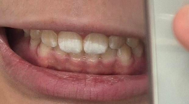 사진이 흐려 확실하지는 않지만 원래 치아 색깔이 그런 것으로 보입니다. 자세한 것은 직접 치과로 가서 검사 받는 것이 좋습니다.