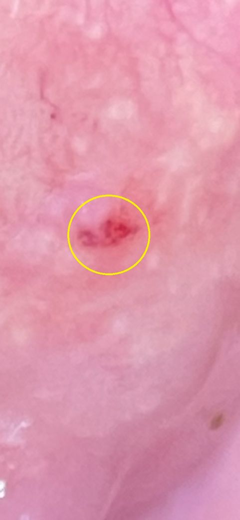 사진으로만 봤을 경우에는 외부적인 자극에 의해서 점막에 손상이 온것으로 보입니다.