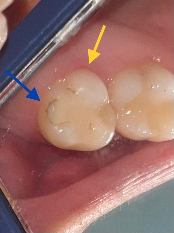 예전에 썩어서 떼웠던 기억이 납니다. 파란 화살표 부분이 깨진 것 같은데 확실하게는 모르겠어요. 혹시 썩어서 깨진걸까요?