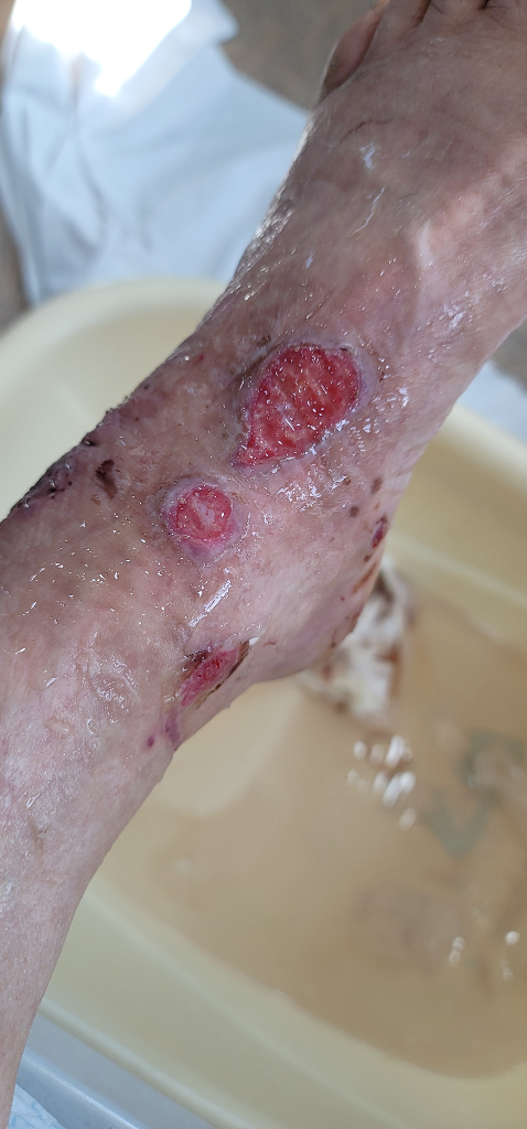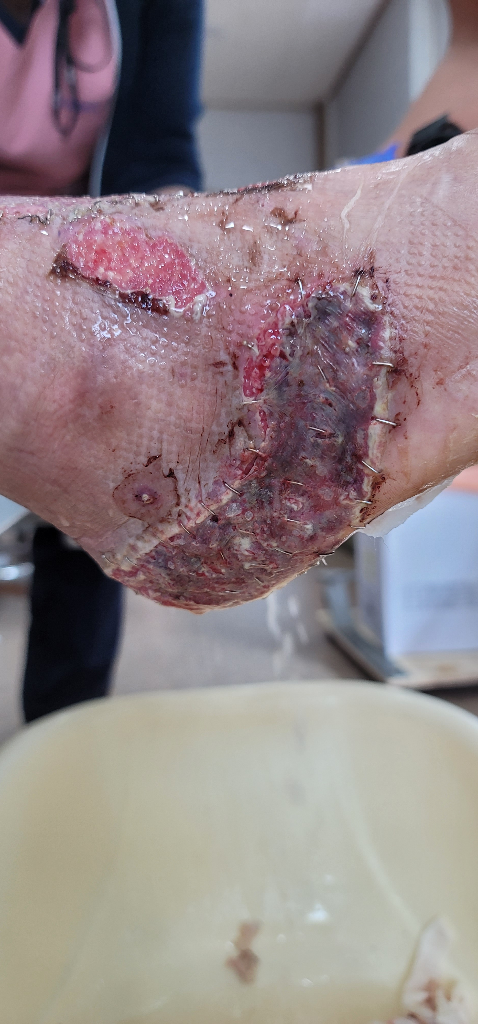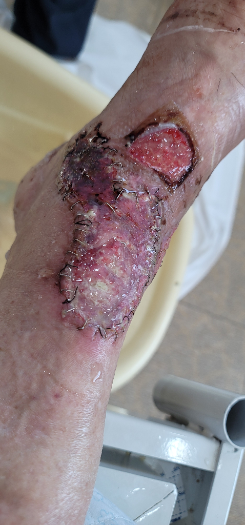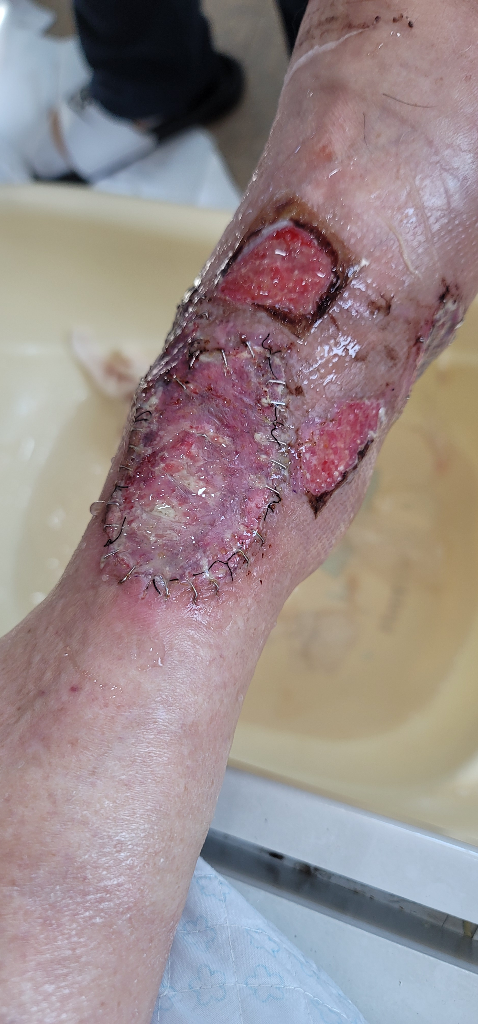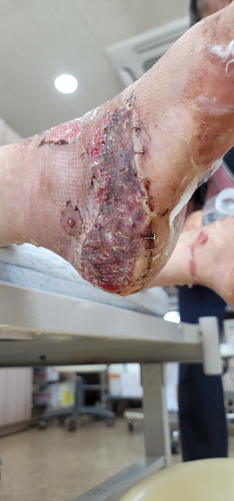 현재로서는 염증부위가 심하고 피부 결손이 많으므로 영양 및 수분 섭취를 충분히 해주시는 것이 중요하겠습니다. 자세한 상태에 대해서는 주치의가 가장 잘 파악하고 있을 것 같으므로 내원하시어 상의를 해보시는 것이 좋겠습니다.