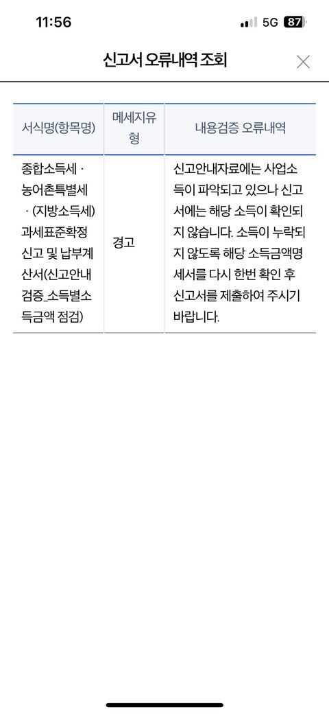사업소득이 있으신데 작성하신 신고서 상에는 사업소득 수입금액이 반영되지 않아 나오는 오류화면입니다.