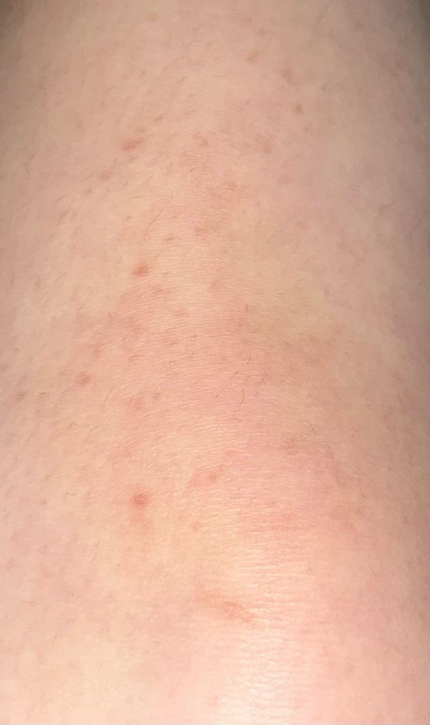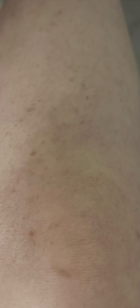 사진 속 모습은 모세혈관 벽이 약해지면서 미세한 출혈이 생겨 피부에 남게 되는 색소성 자반증의 증상으로 보입니다.