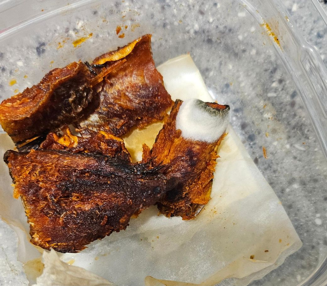 황태 양념한것으로 보이는데 11개월 동안 냉장에 있어가지고 상태는 저렇게 됬고 젓가락으로 건드려봤는데 딱딱했습니다. 일반쓰레기로 버려야 하나요? 아니면 음식물 쓰레기로 버려야 하나요?