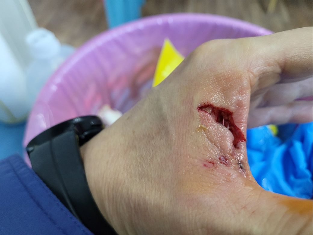 넘어져서 뽀족한거에 찍혀서 엄지와 검지사이 손등이 찢어져 상처부위 5바늘 꿔맴
