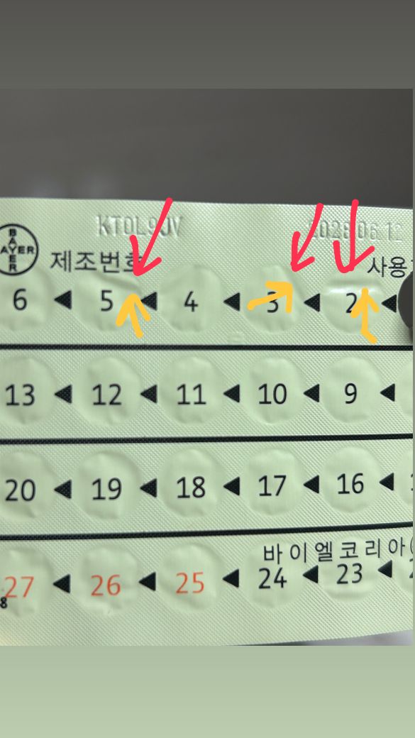 2) 두번째 사진의 5,3,2번째 활성정제 약 포장 부분에 다른 약들과 달리 선이 생겼는데 해당 일자의 약 그냥 먹어도 되나요? 선이 생겨 공기가 들어가거나 해서 피임효과 떨어지나요?