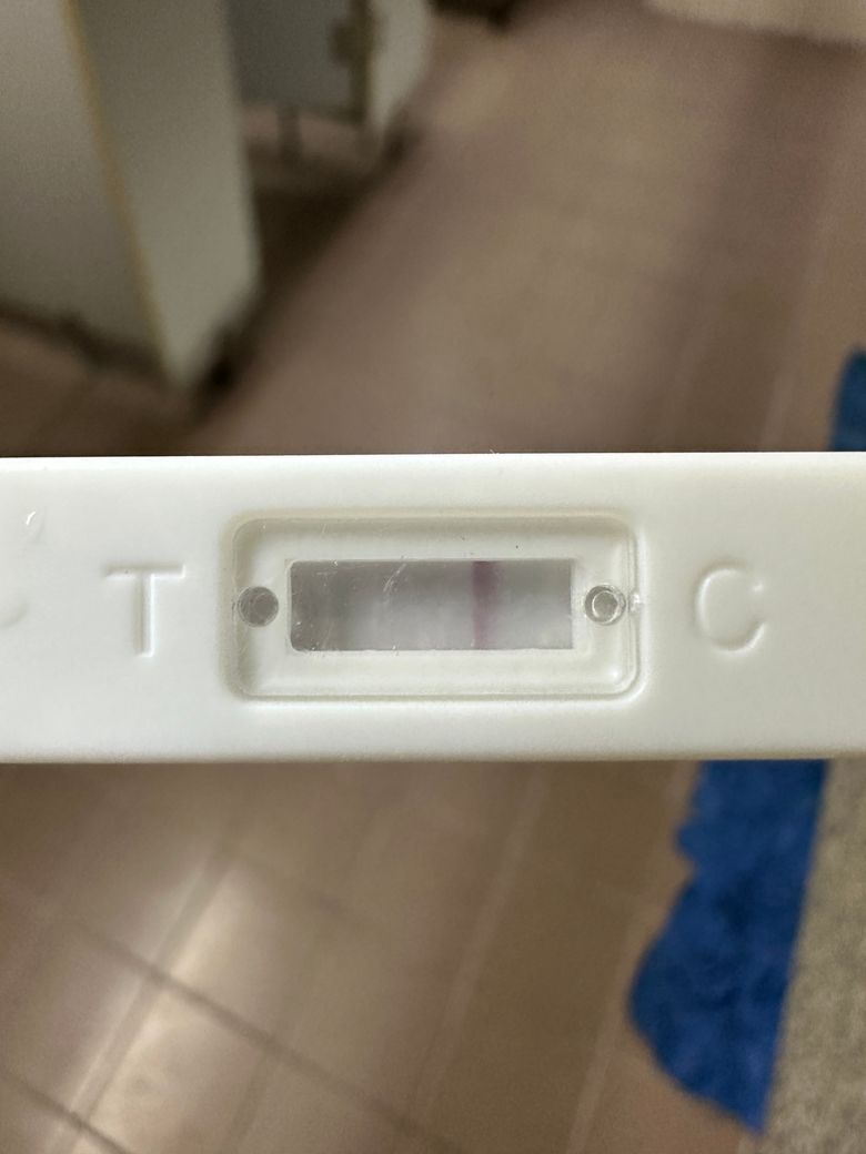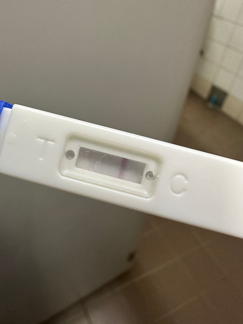 올리신 사진의 임신테스트기를 보았을 때에는 한 줄로 보입니다. 시약선이 보이는 것 같아 보이긴 하지만, 임신 양성 반응으로 판단할 결과로 보이지는 않습니다.
