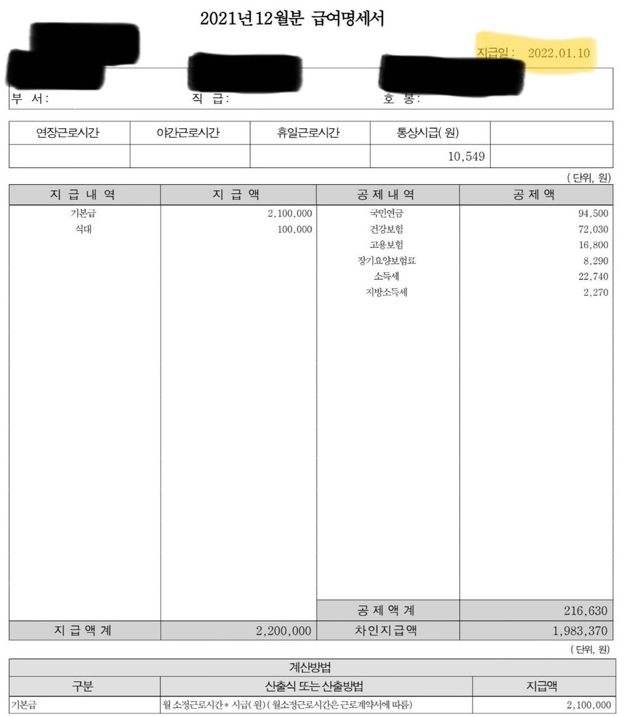 2. 제공하신 급여명세서에 따르면, 해당 내용만으로는 포괄임금제를 도입했다고 보기 어렵겠습니다. 연장근로, 휴일근로 등에 대한 시간 및 임금액도 전혀 잡혀있지 않고, 단순히 기본급과 식대에 관한 사항만 존재하므로 해당 항목이 통상임금을 구성한다고 보게될 수 있습니다.