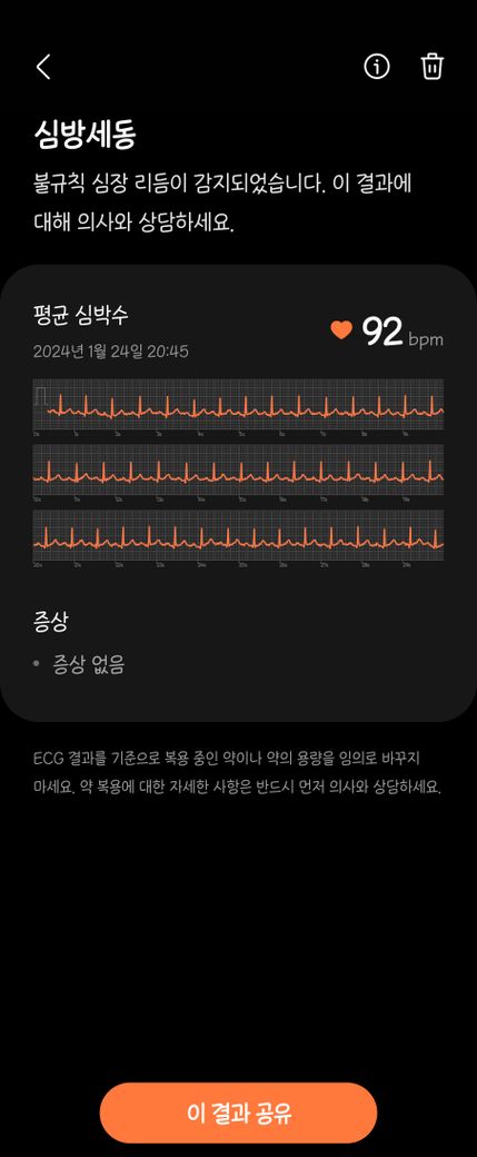 하지만 아까 가슴을 쥐어짜는 느낌이 있었고 조기수축도 오늘따라 빈도가 증가하였고 그상태로 워치 심전도를 재니 심방세동이 나와 지금 믿을건 워치 심전도 뿐입니다.