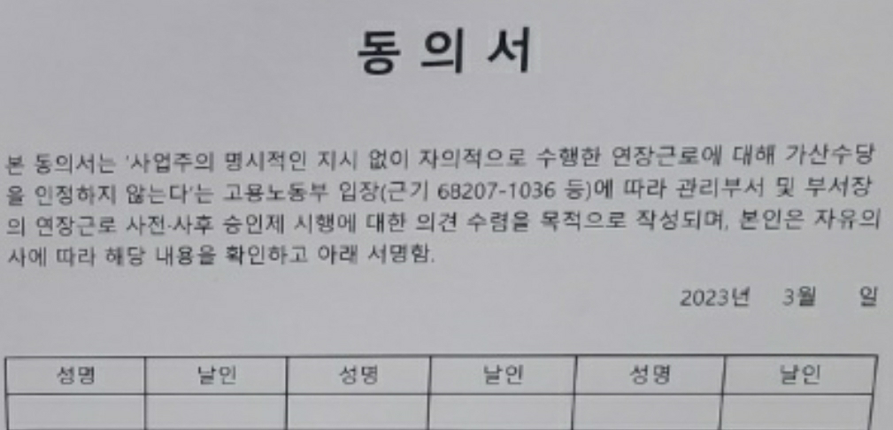 만약 동의서에 직원들이 사인을 하게된다면 연장근무를 하더라도 연장수당을 받을수없게 되는건가요??