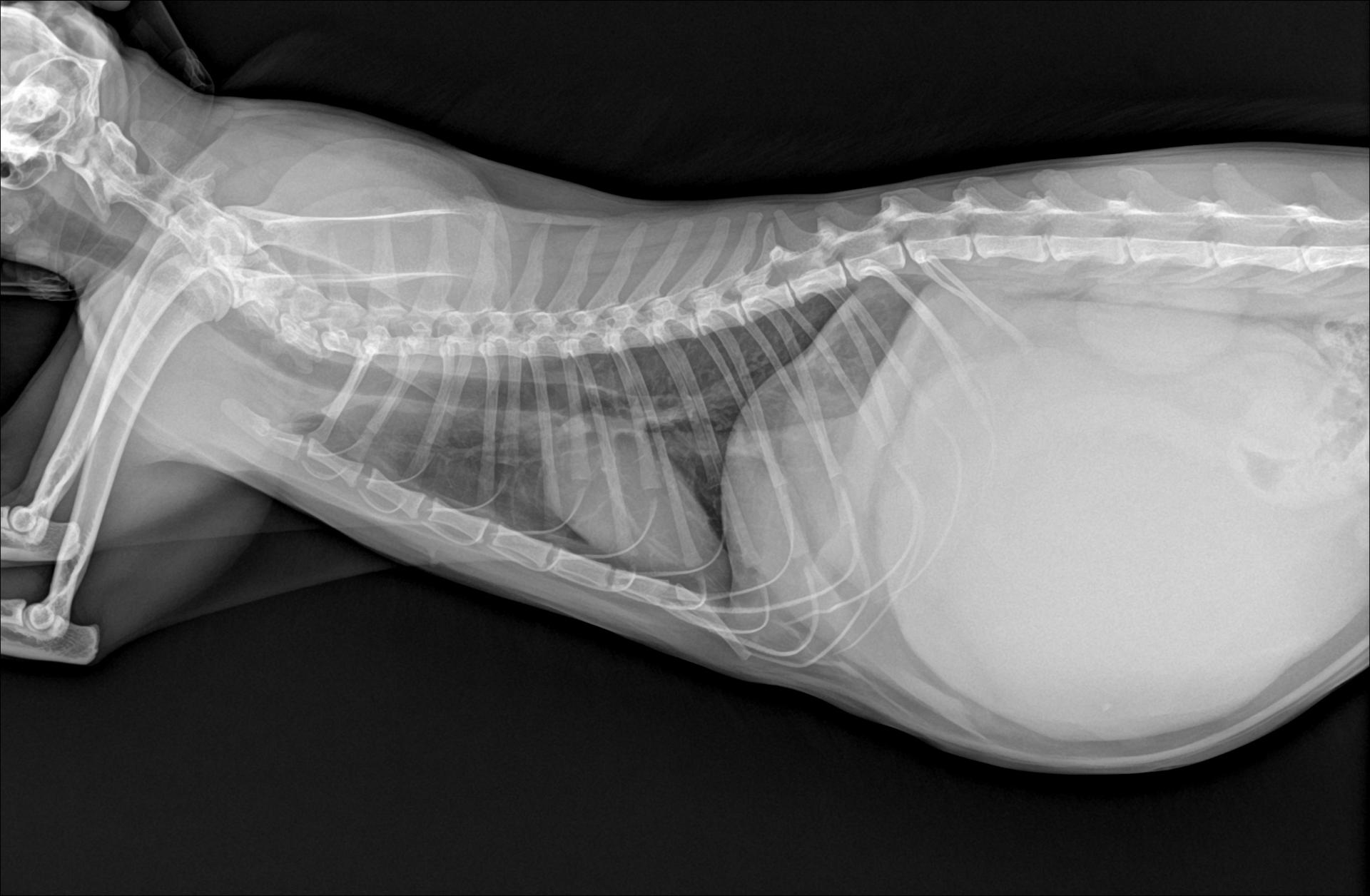 위가 비정상적으로 늘어난 경우, 위 내부에 가스나 음식물이 빠져나가지 못해 팽창하면서 주변 장기를 압박합니다. 이로 인해 혈류가 감소하고, 위벽 허혈이나 괴사, 순환장애가 동반될 수 있습니다. 특히 고양이는 개보다 위염전(GDV)이 드물지만, 장염이나 종양, 위유문부 협착, 혹은 삼킨 이물로 인해 위 내용물이 배출되지 않아 2차 확장이 생기기도 합니다. 또한 복부 팽창이 심하면 횡격막을 눌러 호흡곤란이 나타나고, 잇몸 창백이 심화될 수 있습니다. 현재 응급상황입니다.
