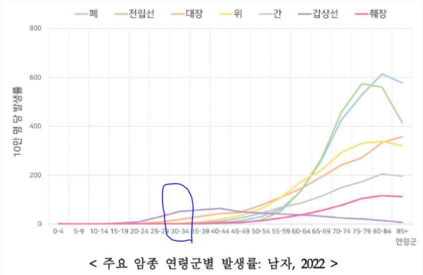국가암정보센터에서 캡처한 연령별 암발생률 (2022년)입니다.