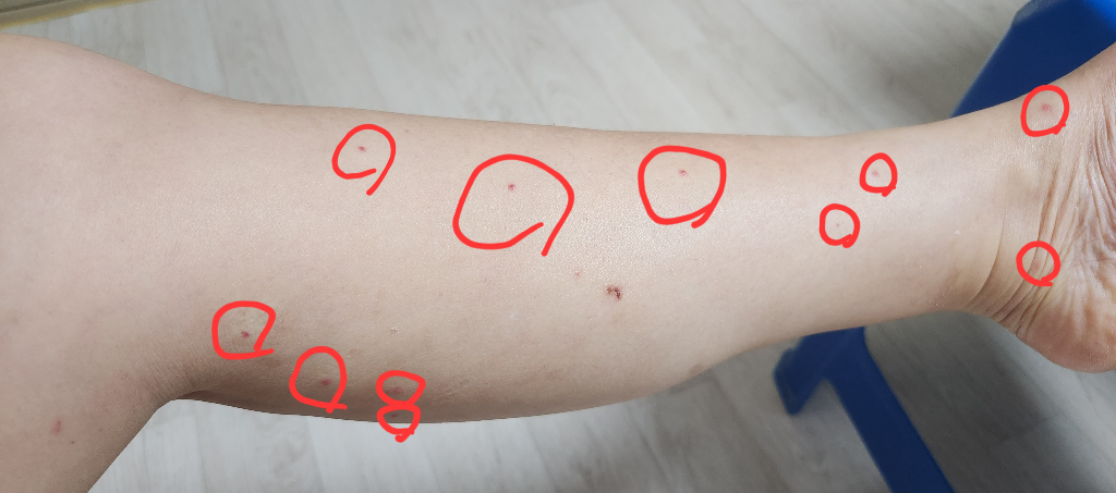 두드러기, 발진으로 보이는 증상입니다.