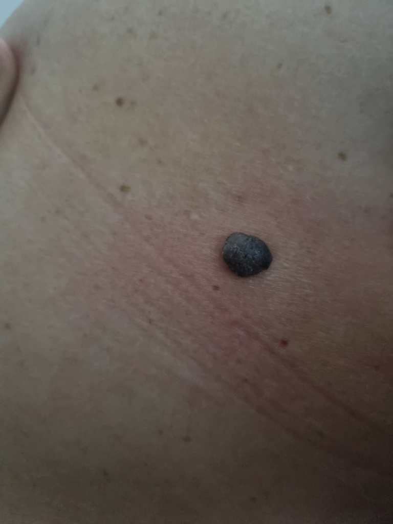 멜라닌세포모반으로 보이며 양성 병변이므로 당장 큰 걱정은 없을 가능성이 높으나 일부에서 흑색종과 같은 질환의 위험이 높아지므로 피부과를 방문해 진찰받아보시기 바랍니다.