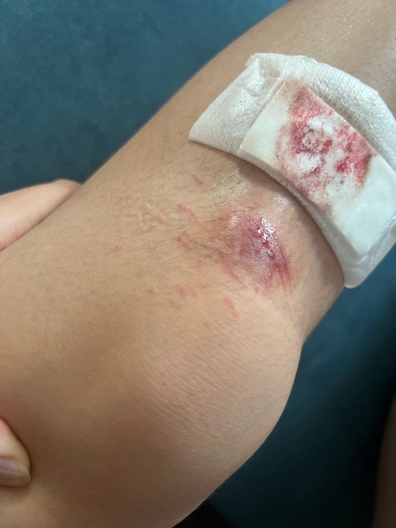 넘어진 것과 현 증상과 연관성을 논하긴 어려우나 감염의 위험성이 있으므로 상처를 흐르는 물에 잘 씻고 물기를 닦은 후 소독을 하고 상처 회복을 위해 습윤 밴드를 부착하기 바랍니다.