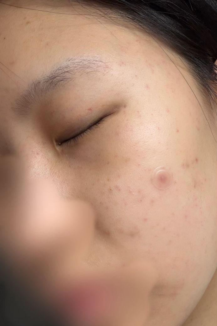 사진을 비교해보면, 오전에는 여드름 후 홍반(post-inflammatory erythema) 정도만 관찰되던 피부가, 저녁에는 뺨 부위에 산재한 작은 구진성(papular) 병변들과 한 개의 비교적 뚜렷한 구진이 새로 생긴 것이 확인됩니다. 전반적인 분포 양상과 발생 경과를 고려했을 때, 가장 가능성이 높은 원인은 접촉성 피부염(contact dermatitis), 특히 화장품에 의한 자극성 혹은 알레르기성 반응입니다.