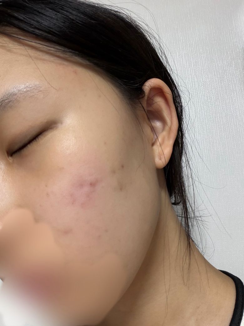 오랜만에 화장을 했다는 점이 중요한 단서입니다. 평소에 잘 쓰지 않던 제품을 다시 사용하면 피부 장벽이 재자극에 더 민감하게 반응할 수 있고, 특히 기저에 여드름성 피부가 있는 경우 이미 장벽 기능이 저하되어 있어 자극 반응이 더 빠르게 나타나는 경우가 많습니다. 수 시간 내 발현된 점은 알레르기성보다는 자극성 접촉 피부염에 더 부합하는 시간 경과이기도 합니다. 다만 두 번째 사진에서 보이는 뺨의 독립된 구진 하나는 형태가 조금 다른데, 이는 막힌 모공에서 비롯된 구진성 여드름 병변일 가능성도 함께 고려됩니다.