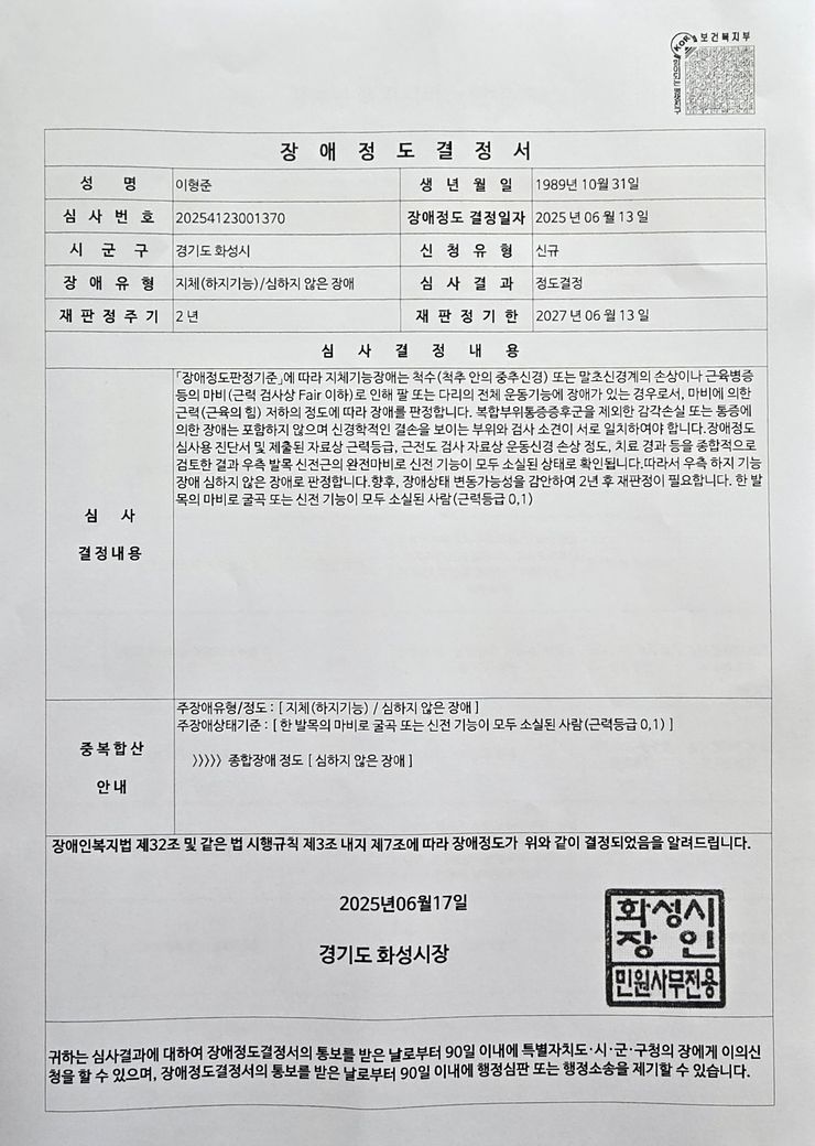 위와 같이 오른쪽 발목이 움직이지 않아 장애등급신청했고 장애심사 후 등급판정을 받았습니다.