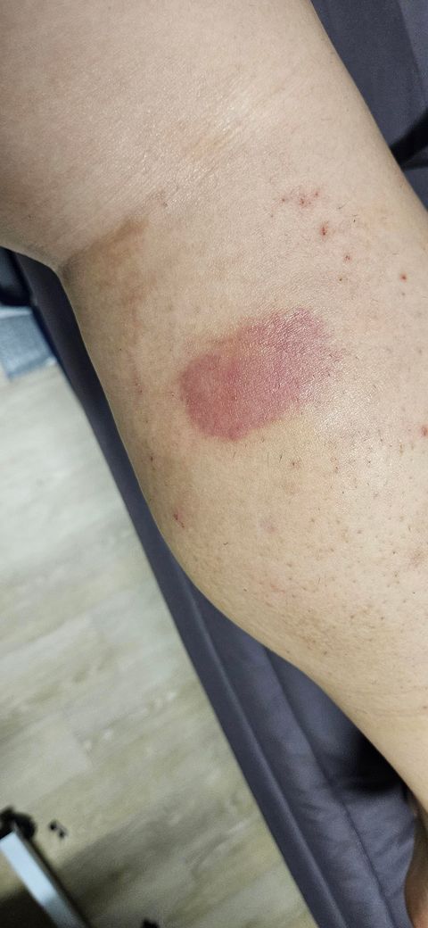 농막에서 일을 하다가 무릎을 접히며 앉앗더니 뭔가 팍 하고 찔리는 듯한건지 베인듯한 느낌이 낫엇습니다 몇일지나니 사진처럼 되엇어요