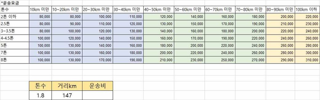 운송비를 자동으로 반영되게 엑셀수식을 넣고싶은데 계속 오류가 나네요 톤수랑 거리만 수정해서 운송비를 매번 자동으로 반영되게 넣고싶어요.. 도와주세용