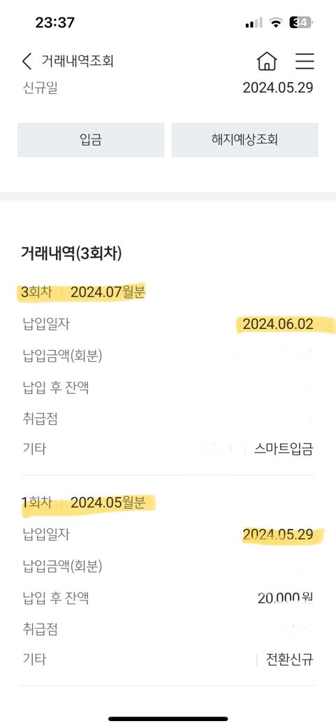 3회차: 첫 납입이 5월 29일에 이루어졌고, 두 번째 납입이 6월 초에 이루어졌기 때문에, 시스템 상에서는 이미 두 번의 납입이 기록되어 있어 3회차로 표시될 수 있습니다.