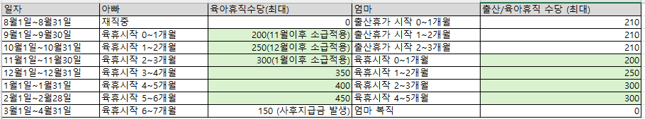 아빠 -> 엄마 순으로 육아휴직을 쓰는 경우 아래표와 같은 계산이 맞을까요?
