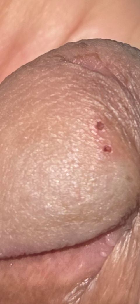4일 전 저녁 샤워 시 귀두가 따가워서 보니 첫번째 사진처럼 되어 있었고 딱지 진 사진은 어제입니다.