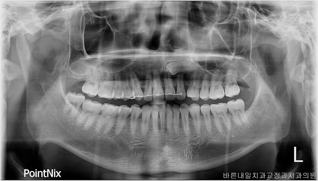 정확한 위치관계는 ct를 찍어 3차원으로 확인해봐야 합니다만 파노라마 사진으로도 매복치가 정상 앞니의 뿌리에 근접하여 위치해 있긴 하네요
