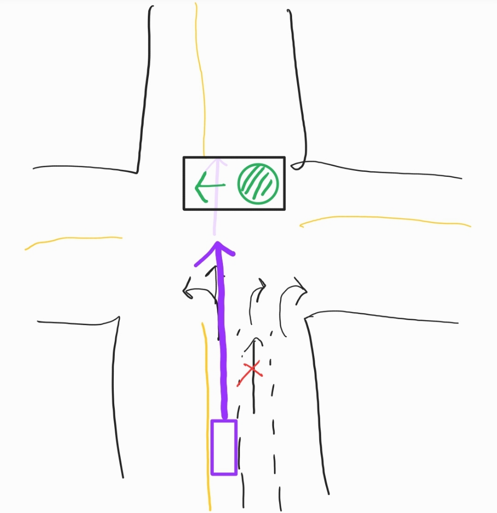 2차선은 직진 불가(도로에 직진 불가 표시 있음)