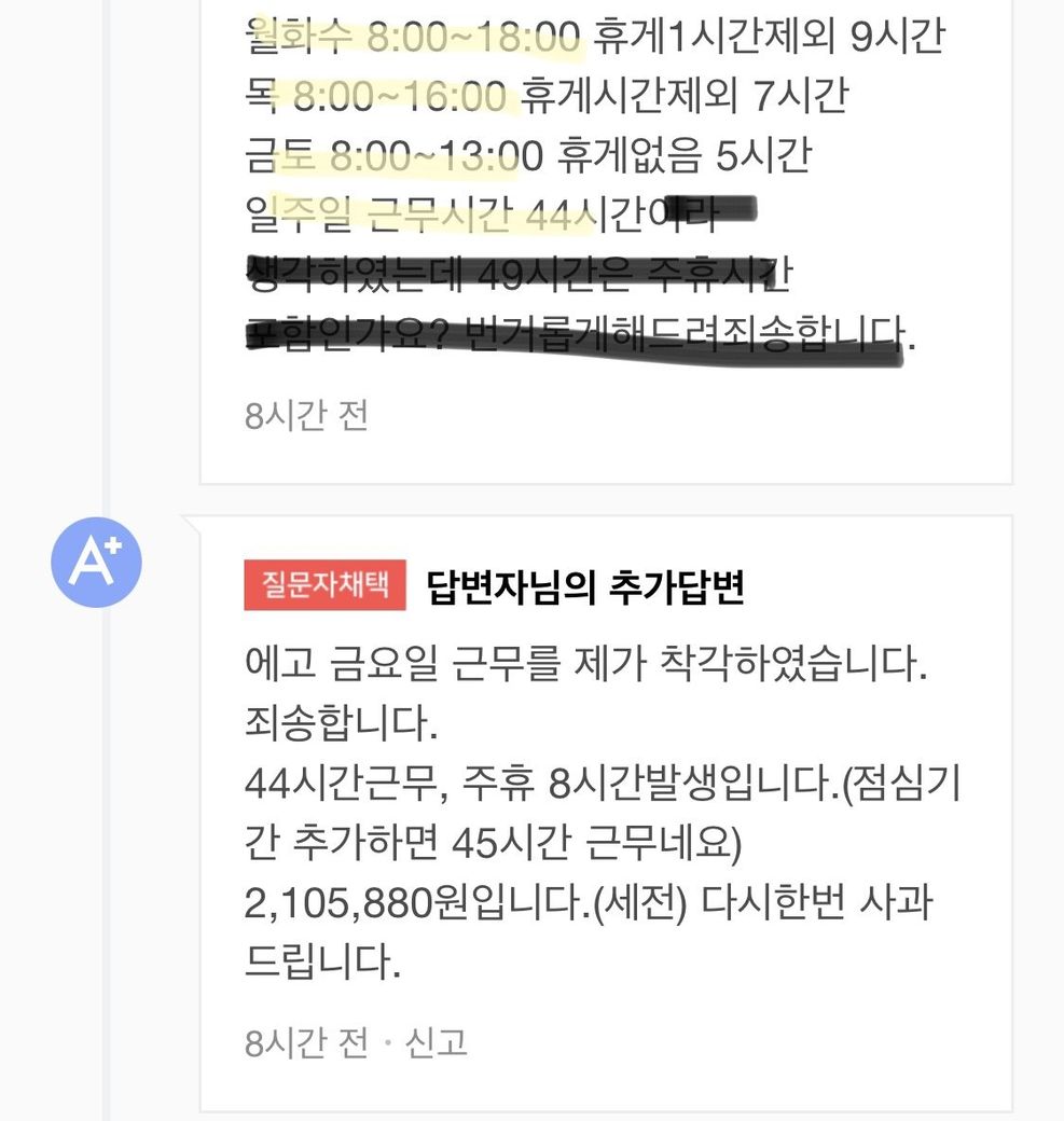 네이버 지식인에 현재 근무시간을 올린 후 답변받은 내용으로 근로계약서 쓸때 그 금액보다 적어서 여쭤보니 저희 회사는 노무사께서 다 계산해주신 계약서로 사용하여 최저시급이 넘는다고 하는데 확인 받고 싶어 질문 드립니다.