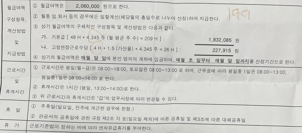 점심시간1시간은일주일에 한번씩 돌아가며 지킴근무를 합니다. 제 계약서가 최저시급을 받고있는건지 알고싶습니다