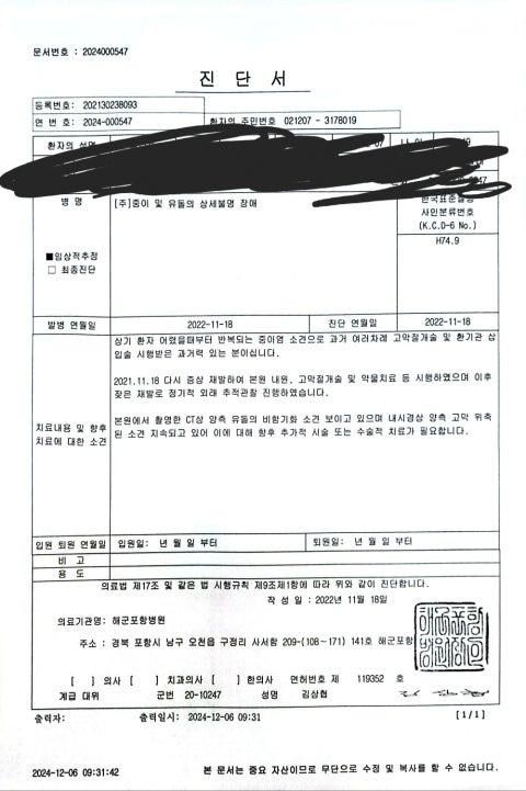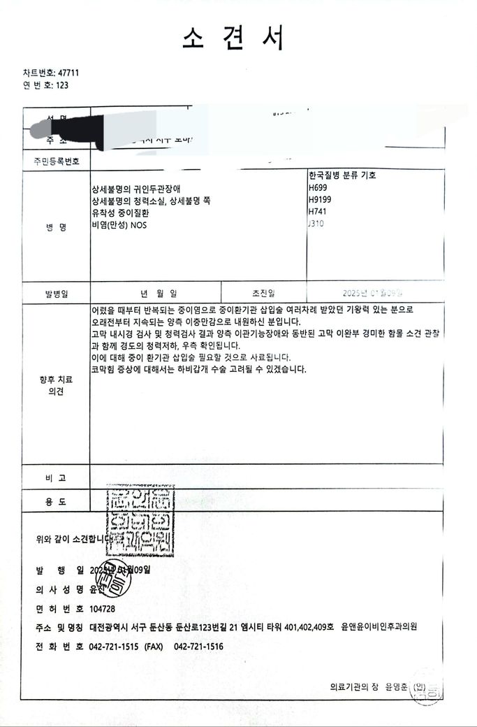 보고 유착성인지 삼출성인지 알려주시고 튜브 넣어야하는지 알려주세요 수술해야한다는 병원 소견서도 첨부 했습니다