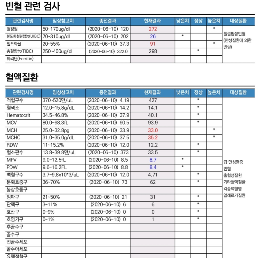 보입니다. 혈색소가 떨어지는 경우, 빈혈이라고 생각하게 되며 이때 철분 수치를 같이 평가하게
