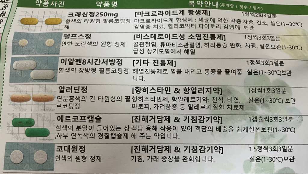 처방받은 약에서 목아픔, 기침만 있다면 크래신정250mg, 펠프스정, 코대원정 이렇게 드시면되겠네요.