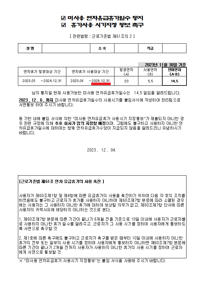 해당 연차휴가사용촉진 통지문에는 연차휴가발생 대상 기간이 명시되어 있는 바, 이는 연차휴가발생 대상 기간까지 근무하여 근로관계가 존속됨을 전제로 발생되는 것으로 볼 수 있습니다.